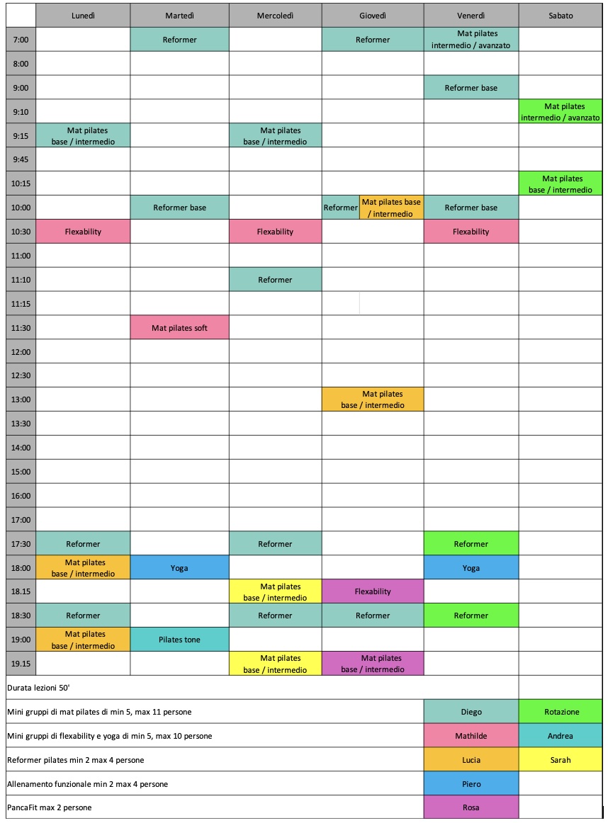 I posti sono limitati – per mat pilates e posturale max 10 persone, per reformer e per l’allenamento funzionale max 3 persone, per PancaFit max 2 persone – quindi è consigliabile prenotare in anticipo.